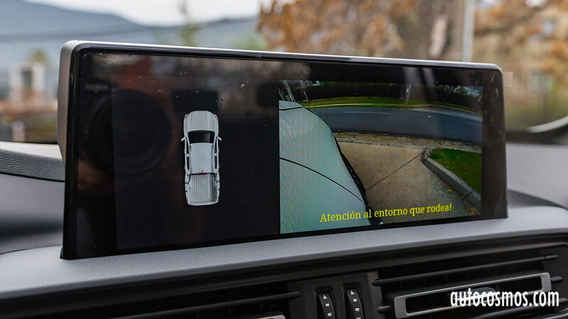 La pantalla también muestra la cámara de retroceso y una curiosa cámara frontal esquinada, que muestra el ángulo frontal derecho cuando vamos a virar, que desde la posición del conductor es donde más cuesta mirar, en especial si hay un perro o un niño en una esquina. Nos recuerda al sistema Lanewatch de Honda.