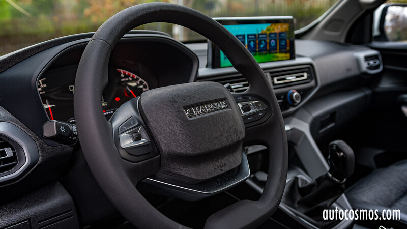 Tal como mencioné en nuestra nota de lanzamiento, aquí hay muchos elementos que son influenciados por Peugeot o derechamente obtenidos de su bin de partes. Por ejemplo, el diseño del volante (regulable en altura y profundidad) imita el diseño de dos brazos de Peugeot, claro que por no contar con un sistema iCockpit, este es más grande. Los comandos, se parecen a los de Peugeot, pero son de Changan y son los mismos que lleva el CS15 y otros modelos de la marca.