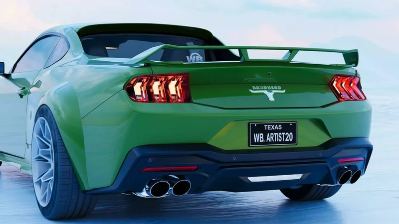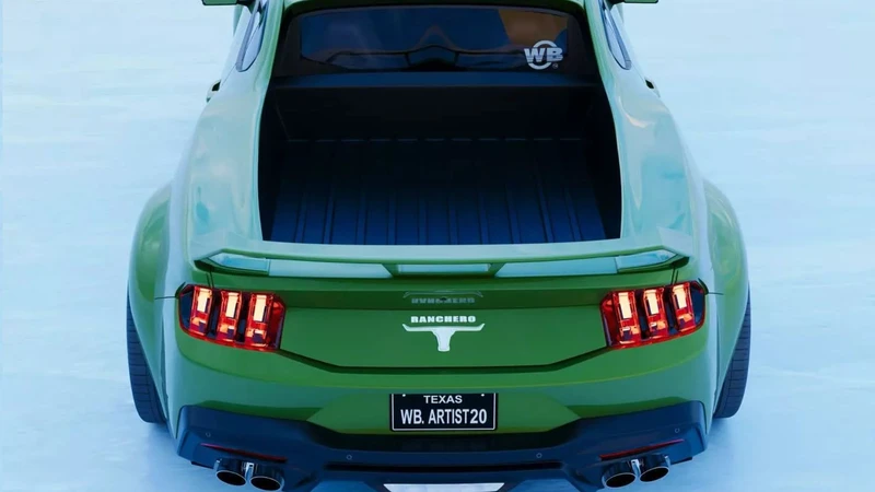El resto del diseño trasero de la hipotética versión de la Falcon / Mustang Ranchero se completa con la silueta de la sexta generación del Mustang GT, con el juego de luces rectangular en cada extremo y una doble salida de escape en ambas esquinas.