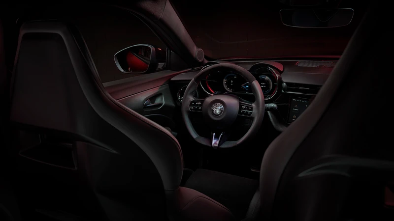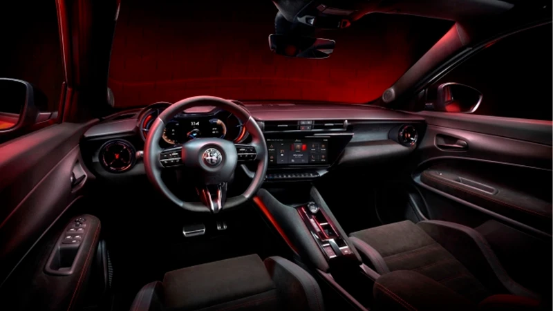 Puertas adentro, el concepto también es nuevo, contando con dos pantallas de 10,25” para el tablero y el sistema multimedia, este último orientado al conductor. El torpedo simula la forma de los instrumentales analógicos de los Alfa Romeo anteriores, con los relojes redondos. Se destaca la presencia de botones físicos para el climatizador y la perilla para el volumen.