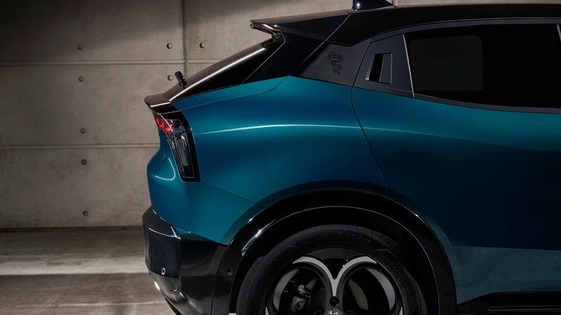 En la parte trasera, llama la atención el intento de “homenajear” la “codatronca” del Giulia TZ de los 60s, con una caída prolongada de la luneta que se remata en un leve spoiler trasero y en el plafón negro que alberga las luces traseras, que recorre el portón horizontalmente y concluye cerca de los guardabarros, de forma vertical. Nuevamente, quizás quedó un poco "sobrecargado" el diseño. Llama la atención la cantidad de apliques negros en toda la carrocería, tanto en los paragolpes, como en el techo, zócalos de las puertas, pasos de rueda y otros, dejando en claro el aspecto de SUV.