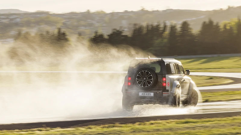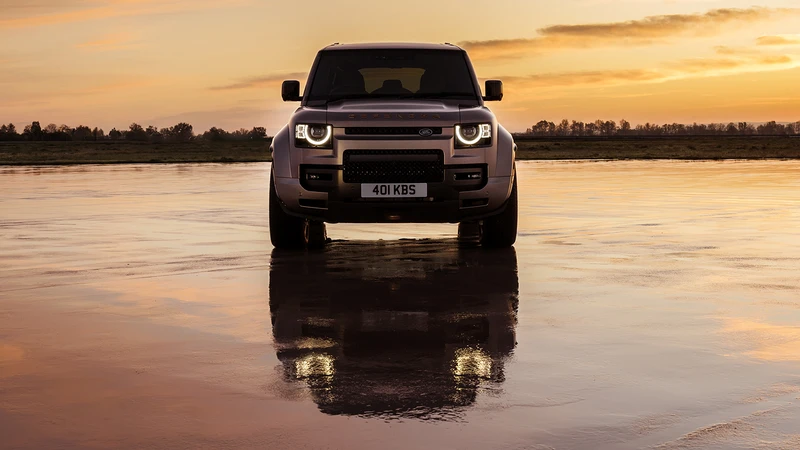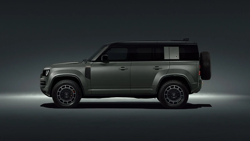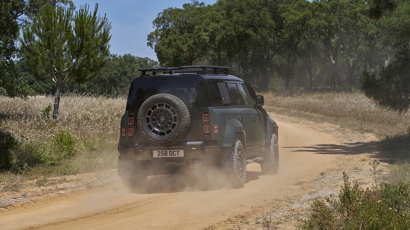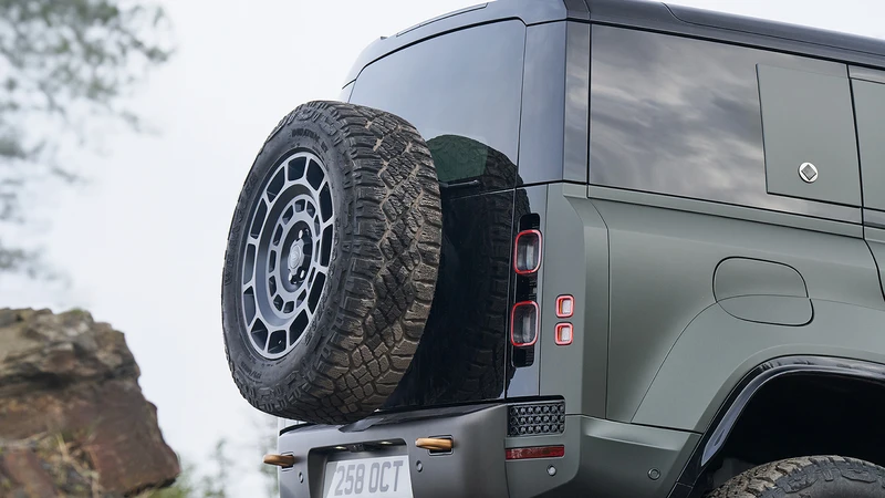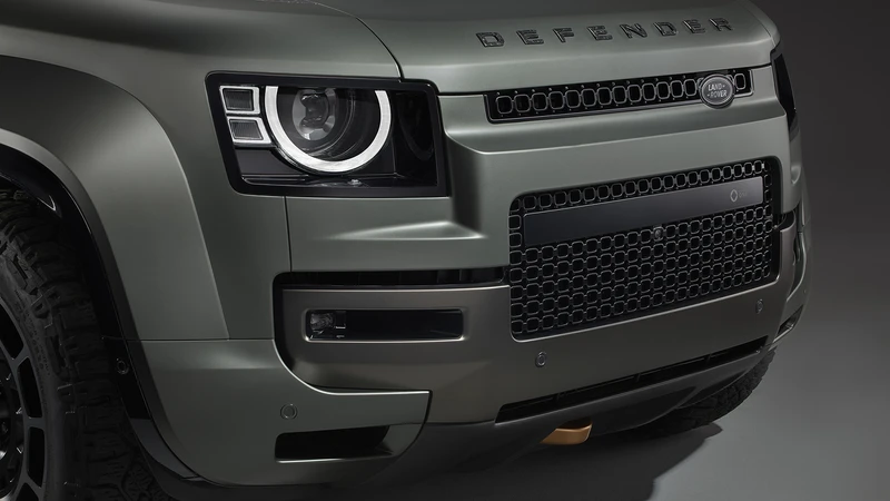 El equipo de Land Rover tomó un Defender 110 y lo hizo 68 mm más ancho, y sumó 28 mm de despeje. Los pasos de rueda son muy abultados, para dar margen al recorrido de la suspensión y al tamaño de las ruedas. Además, la parrilla cuenta con entradas de aire más grandes.