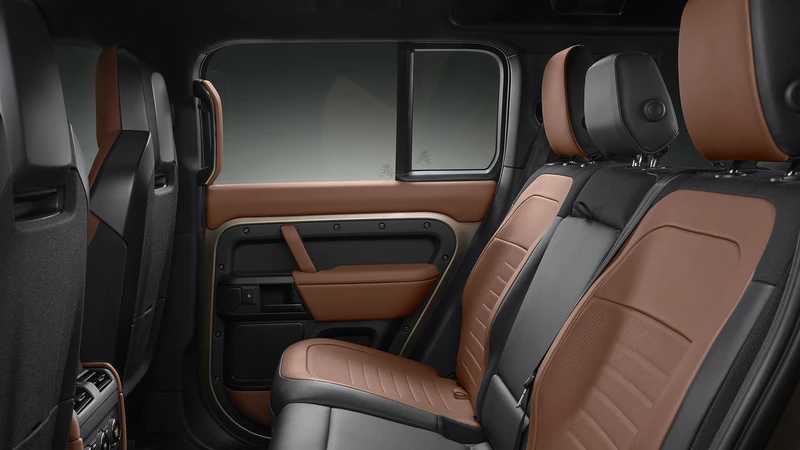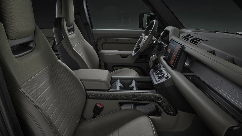 Puertas adentro, sigue siendo como un Defender, con materiales duraderos pero lujosos, acompañados de algunas innovaciones: hay cuatro temas de color que se combinan con detalles en cromo, metal o fibra de carbono forjada, además de algunos materiales ecológicos como las alfombras.