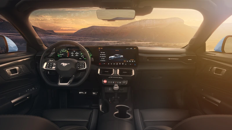 El habitáculo del Mustang cambia notoriamente, dejando de lado la disposición convencional y pasando a una propuesta más tecnológica, con un enorme panel que integra dos pantallas: una de 12,4” para el tablero y otra de 13,2” para el sistema multimedia, que cuenta con SYNC 4. Las dos pantallas son configurables (incluso el tablero puede homenajear al Mustang clásico), y la central cuenta con un apartado “Track Apps”, que permite ver diversos elementos de performance como cronómetros, fuerzas G, rendimiento de frenos, y más.