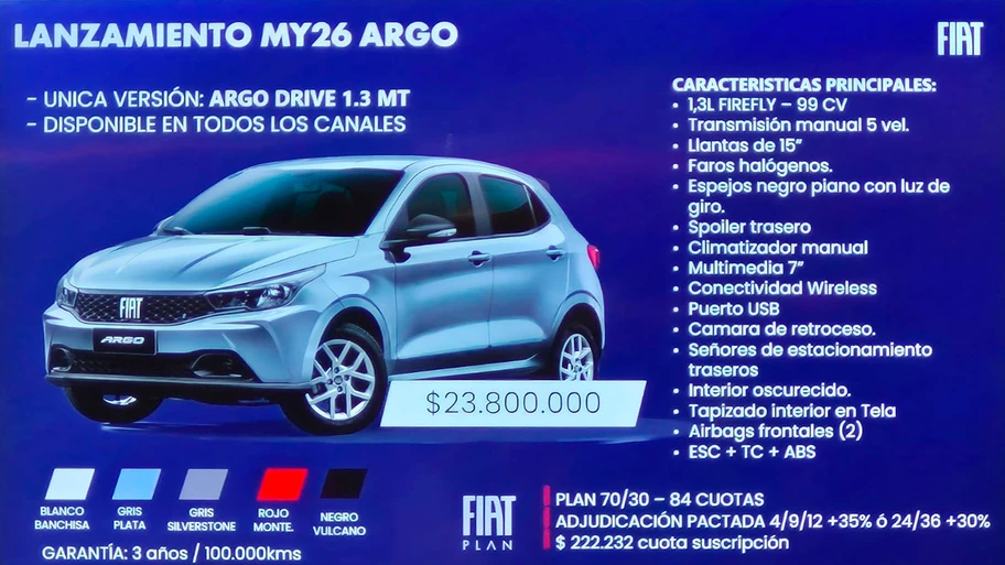 El FIAT Argo Drive 1.3 MT ya está disponible en Argentina a un precio de $23.800.000. La garantía es por tres años o 100.000 km.