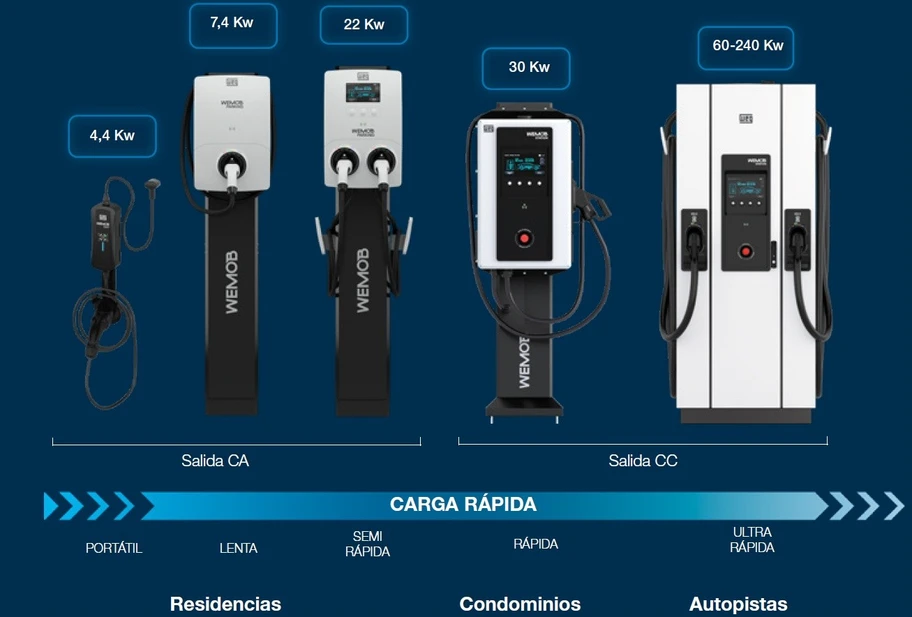 Los WEMOB Easy, Wall y Parking son de corriente alterna. El primero es portátil, un poco más grande que el cargador de una Notebook, no requiere ningún tipo de instalación y puede conectarse en cualquier enchufe.