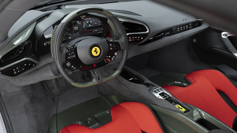 Siguiendo con los elementos que recuerdan a la F40, esta SC40 rinde muchos honores al Kevlar, usado extensivamente en el modelo clásico, y que ahora podemos ver en muchas partes del auto, ya sea en el vano motor o en el interior, como la estructura de los asientos, en las alfombras, y el volante, entre otros elementos, que ayudan a diferenciar el habitáculo del de una 296 GTB.