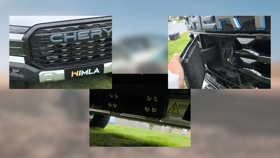 Siendo observadores, notamos el contorno del logo de Chery en azul, que indicaba que se trataba de un modelo electrificado. Al revisarla, encontramos un enchufe de carga, y mirando por debajo el chasis, un enorme paquete de baterías, lo que significa que la Himla también será la primera camioneta eléctrica de la marca.