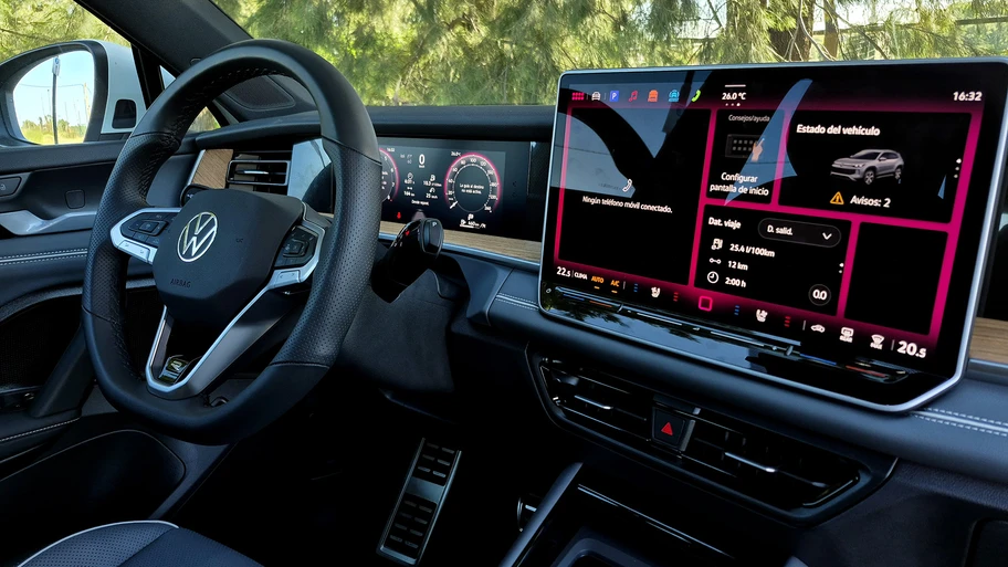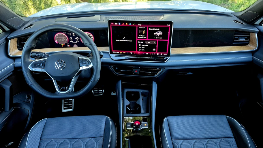 Antes de ver que tal se mueve, empecemos por lo importante, la interacción entre conductor y máquina, que es muy buena con todas las regulaciones, eléctricas de butaca, que además es cómoda. El volante, al menos en este R-Line me pareció de aro excesivamente grueso, y la visibilidad tiene las limitaciones propias de todo SUV moderno, por eso se agradecen los sensores y cámaras de 360º.