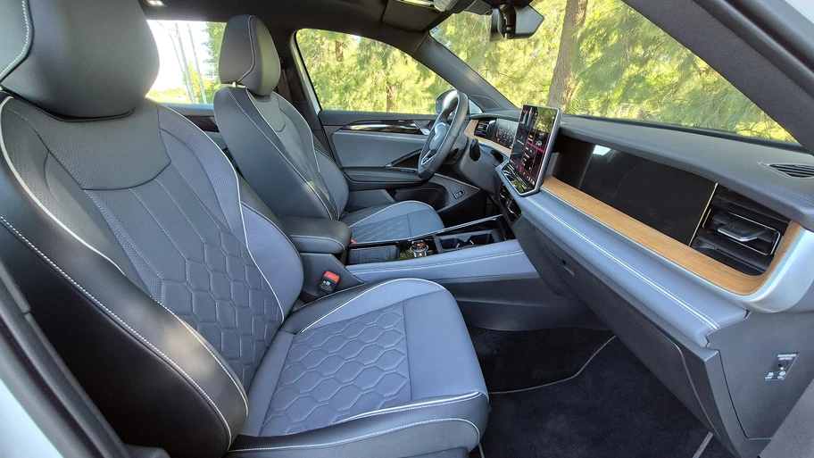 El panorama es muy distinto a lo que conocíamos de Volkswagen, no solo por la pantalla como pegada sobre el tablero, sino por las líneas generales con la franja metalizada y la de símil madera clara que envuelven todo de punta a punta. Los plásticos y uniones se sienten como en buen VW, de calidad, precisos y sólidamente unidos, e incluyen cuerina en varias secciones .