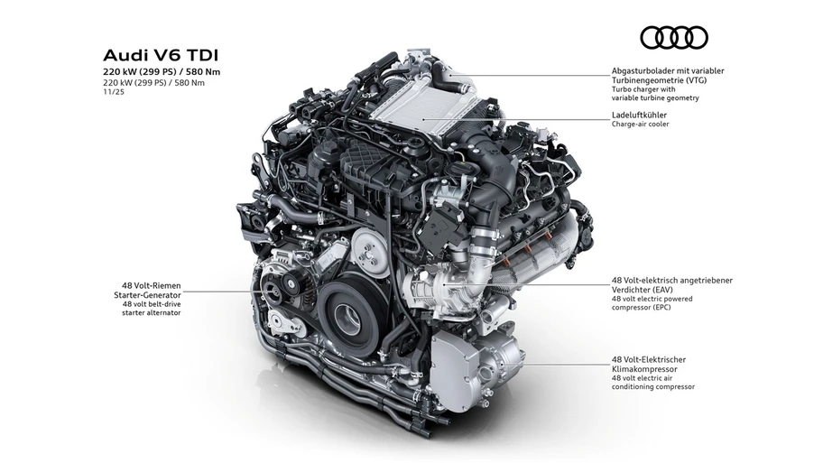 El V6 de la Amarok se denomina “EA897”, y ahora, Audi presentó una evolución, denominada “EA897evo4”, y su principal novedad es que incorpora un sistema Mild Hybrid de 48V, con un motor eléctrico de 24 CV y 230 Nm en la transmisión, que incluso permite mover el vehículo a bajas velocidades, sin usar el de combustión.