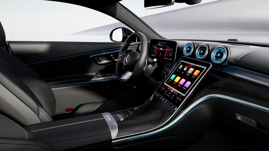 Puertas adentro, la disposición es similar a la del CLE 53, con la pantalla vertical que sobresale de la consola central, el tablero digital, el volante con radios dobles, y diferentes materiales.