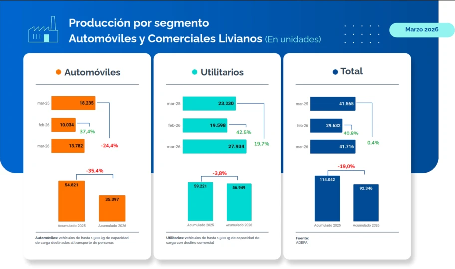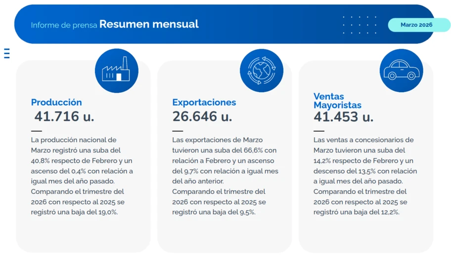 Según el informe de industria correspondiente a marzo de 2026 por ADEFA (Asociación de Fabricantes de Automotores) así fueron los números de producción, exportación y ventas de las automotrices radicadas en Argentina.